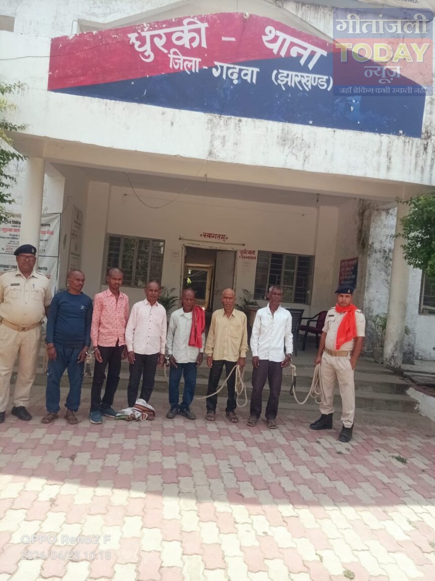 सगमा (गढ़वा): पुलिस अधीक्षक गढ़वा आशुतोष शेखर के निर्देश पर फरार वारंटियों के विरुद्ध लगातार चलाए जा रहे छापेमारी अभियान के तहत धुरकी पुलिस को बड़ी सफलता मिली है। विभिन्न मामलों में संलिप्त छह वारंटियों को गिरफ्तार कर न्यायालय भेज दिया गया है।इस संबंध में जानकारी देते हुए धुरकी थाना प्रभारी जनार्दन राउत ने बताया कि पुलिस अधीक्षक के निर्देशानुसार बीती रात विशेष छापेमारी अभियान चलाया गया। अभियान का मुख्य उद्देश्य लंबे समय से फरार चल रहे वारंटियों की गिरफ्तारी सुनिश्चित करना था। अभियान के दौरान C.F. No.- 2951/2017 के तहत रामजी कोरवा (38 वर्ष), सम्पत कोरवा (67 वर्ष), रामराज कोरवा (51 वर्ष), तकदीर कोरवा (50 वर्ष) और विजय कोरवा (43 वर्ष) को गिरफ्तार किया गया। वहीं DW वारंटी नागेंद्र ओरांव को भी पुलिस ने दबोच लिया। सभी गिरफ्तार अभियुक्त ग्राम परासपानी खूर्द एवं कटहर के निवासी हैं। पुलिस ने आवश्यक कानूनी प्रक्रिया पूरी करते हुए सभी को नगर उंटारी न्यायालय एवं फैमिली कोर्ट, गढ़वा में प्रस्तुत करने के लिए भेज दिया है।
